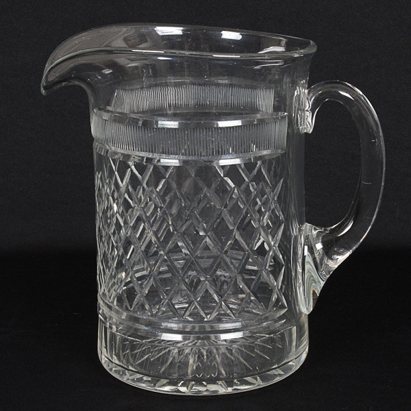 • VIDRO, uma (1) imponente jarra, incolor e translúcida, lapidada em sulcos, caneluras e treliças, medindo 22 cmaltura, sinais de uso, vide foto.