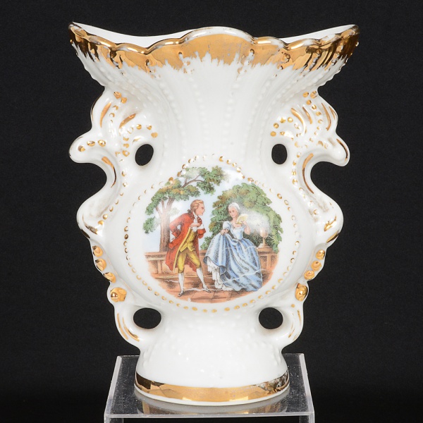 • PORCELANA, um (1) vaso floreiro com ornamentação policromada, representando cena de galanteio,possivelmente baseada na obra de FRAGONARD (Jean Honoré Fragonard, Grasse 1732 Paris 1806, pintor, desenhista egravurista francês, estilo Rococó, conhecido pela exuberância e hedonismo de sua obra, pinturas do gênero comatmosfera de intimidade e erotismo), modelagem relevada em perolados e elementos vegetalistas, generosos arremates aouro, medindo 16 cm altura, sem marca de manufatura aparente, sinais de uso, vide foto.