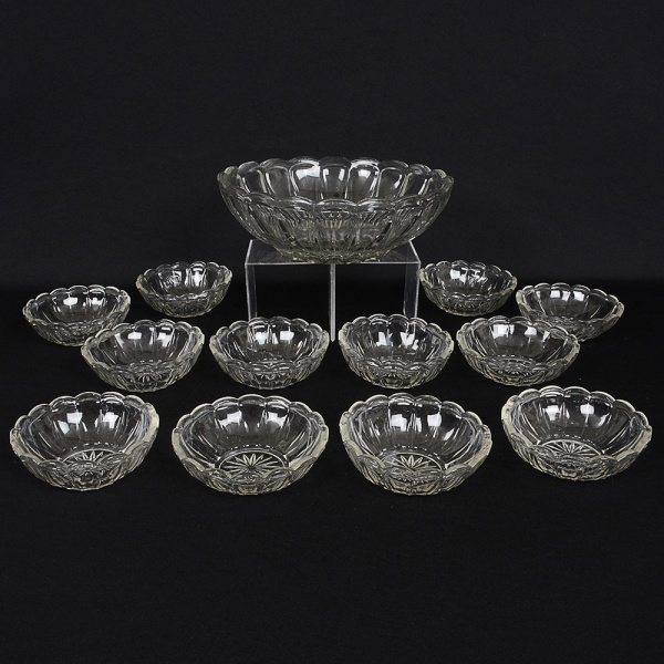 • VIDRO, conjunto com treze (13) itens, incolores e translúcidos: 1 saladeira e 12 taças, modelados em gomos, fundoestrelado, medindo respectivamente 25 cm e 11 cm diâmetro, sinais de uso, vide foto.