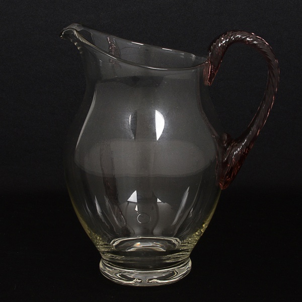 • CRISTAL, uma (1) jarra bojuda incolor, alça na tonalidade roxa em torçaide, translúcida, procedênciaChecoslováquia, medindo 20 cm altura, sinais de uso, vide foto.