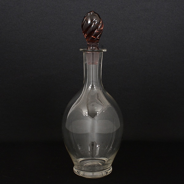 • CRISTAL, uma (1) licoreira bojuda incolor, tampa na tonalidade roxa em torçaide, translúcida, procedênciaChecoslováquia, medindo 30 cm altura, não aparenta ter sido usada ou pouco uso, vide foto.