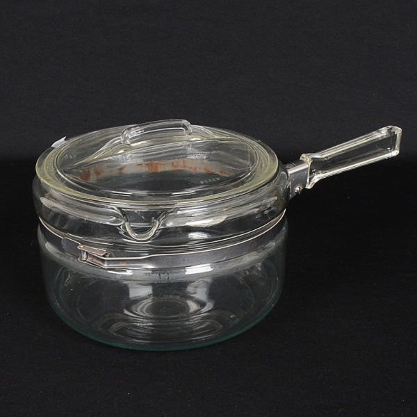 • VIDRO, uma (1) panela com tampa, incolor e translúcida, marca PYREX, Made in USA, cabo em aço e com trava,medindo 18,5 cm diâmetro, sinais de uso, vide foto.