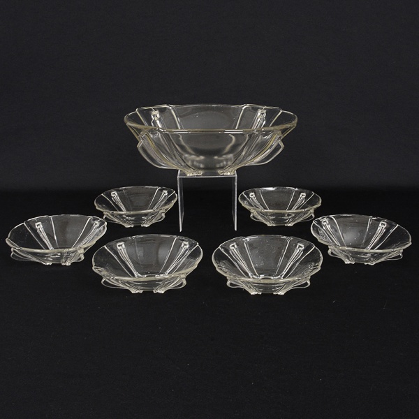 • VIDRO, conjunto com sete (7) itens, incolores e translúcidos: 1 saladeira e 6 taças, modelagem no padrão ArtDeco, medindo respectivamente 28 cm e 14 cm diâmetro, sinais de uso, vide foto.