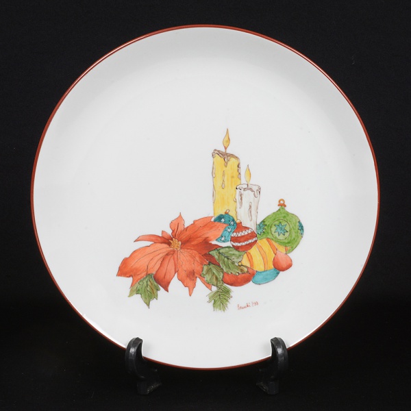 • PORCELANA, um (1) prato ornado com motivos natalinos em policromia, Atelier LUDI/93, medindo 26 cmdiâmetro, sinais de uso, vide foto.