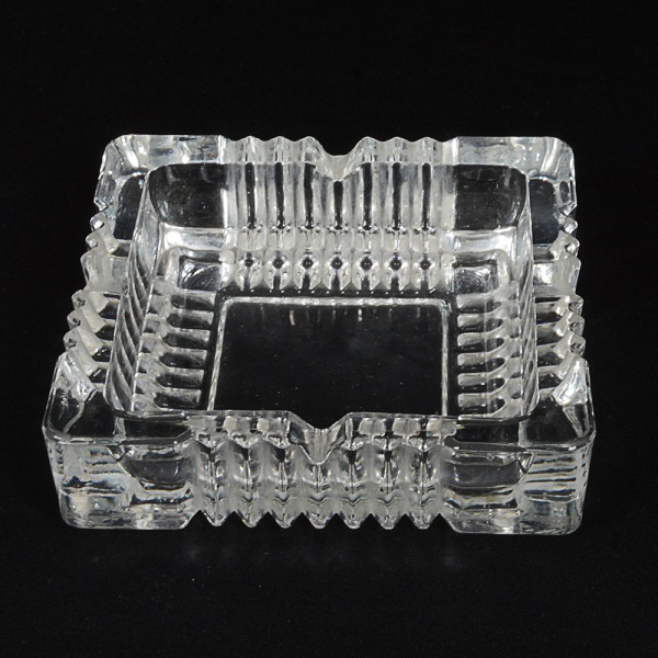 • CRISTAL, um (1) cinzeiro quadrangular, incolor e translúcido, moldado em caneluras, medindo m15 x 15 x 4 cm,sinais de uso, vide foto.
