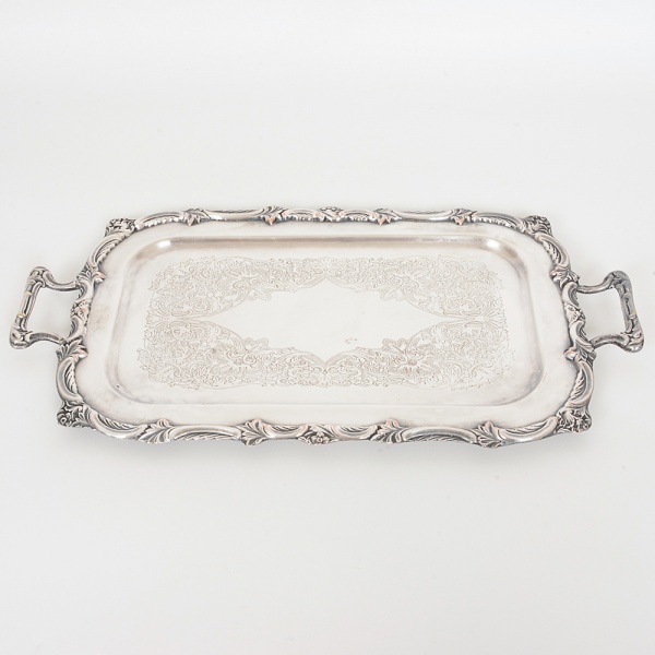 • METAL PRATEADO, uma (1) bandeja retangular, fundo com ornamentação vegetalista em baixo relevo, bordareforçada e relevada em volutas e elementos vegetalistas, alças idem, medindo 37 x 23,5 cm mais as alças, sinais de uso,vide foto.