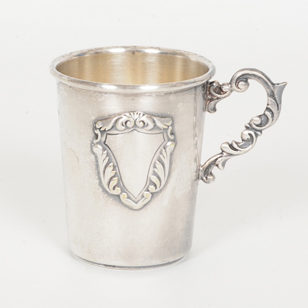 • METAL PRATEADO, um (1) copinho com alça, relevado em volutas, ligeiramente obcônico, ornado com escudo,puncionado SPAM, medindo 7 cm altura, sinais de uso, vide foto.