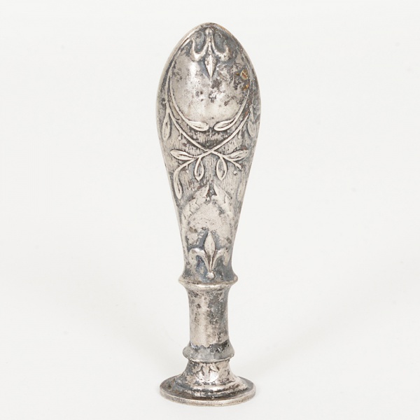 • PRATA PORTUGUESA, um (1) antigo sinete com ornamentação relevada em elementos vegetalistas, período ArteNova, traz as iniciais EL, medindo 7,5 cm altura, peso 10,9 gr., punções portugueses de ourives e contrastaria,parcialmente legíveis, sinais de uso, vide foto.