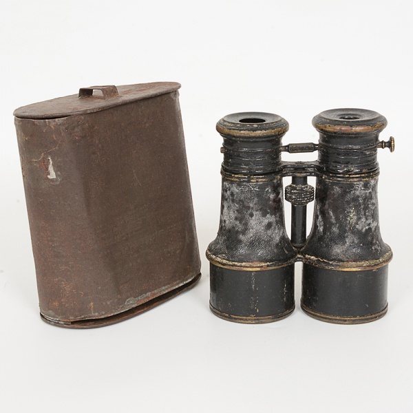 • DIVERSOS, um (1) antigo binóculo confeccionado em metal e outros materiais, tonalidade preta, sem marca demanufatura aparente, sinais de uso e defeitos, acondicionado no estojo em folha de flandres com sinais de oxidação,sinais de uso, vide foto.