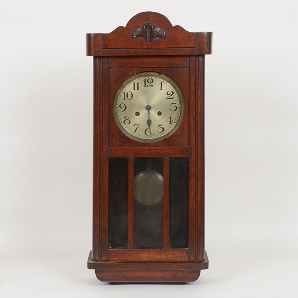• RELÓGIO, um (1) antigo carrilhão de parede, mostrador em metal com algarismos arábicos e dois furos para darcorda, sinalizando a cada meia hora e hora cheia, gabinete em madeira, portinhola envidraçada, medindo 69 cm altura,possui a chave borboleta, usado, não testado e sem garantia, vide foto.
