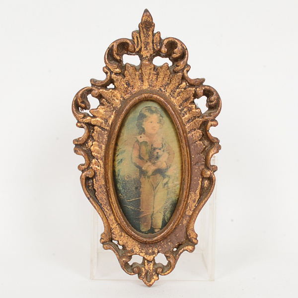 • QUADRO, uma (1) miniatura oval em tecido estampado policromado, representando menino com cachorro no colo,moldura em estuque, vazada e com douração, medindo 21 x 11,5 cm, vide foto.