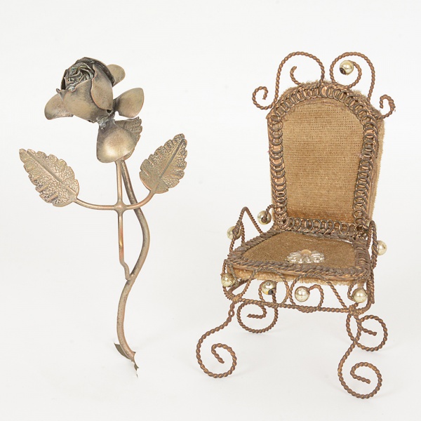 • DIVERSOS, dois (2) itens: 1 escultura na forma de rosa, confeccionada em metal prateado, medindo 14 cmcomprimento; 1 cadeira miniatura para casa de bonecas, confeccionada em aramado vergado, tecido, esferas metálicas eaplique facetado, faltando partes, medindo 12 cm altura, vide foto.