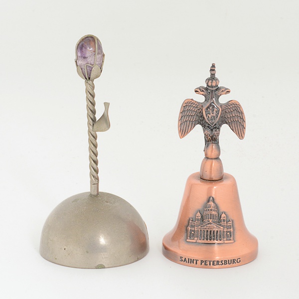 • DIVERSOS, duas (2) sinetas de mão, confeccionadas em metal: 1 souvenir de Saint Petersburg, Rússia, medindo 9cm altura; 1 encimada por ametista, medindo 10 cm altura, sinais de uso, vide foto.