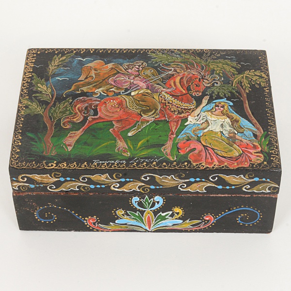 • DIVERSOS, uma (1) caixa retangular, confeccionada em madeira laqueada na tonalidade preta, ornamentaçãopolicromada pintada a mão representando cena de galanteio, laterais em elementos vegetalistas, interior com forraçãoaveludada ou feltro na tonalidade vermelha, medindo 14 x 10 x 5 cm, sinais de uso, vide foto.
