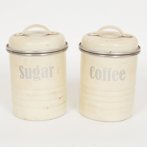 • DIVERSOS, dois (2) recipientes para acondicionar café e açúcar, confeccionados em folha de flandres, marcaTYPHOON, ligeiros sinais de oxidação na base, medindo 16 cm altura e 10 cm diâmetro, sinais de uso, vide foto.