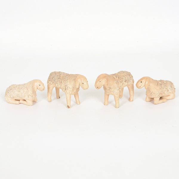 • ESCULTURAS, quatro (4) representando ovelhas, confeccionadas em cerâmica e esmaltadas na tonalidade creme,pequenas perdas, medindo em média 9 cm, sinais de uso, vide foto.