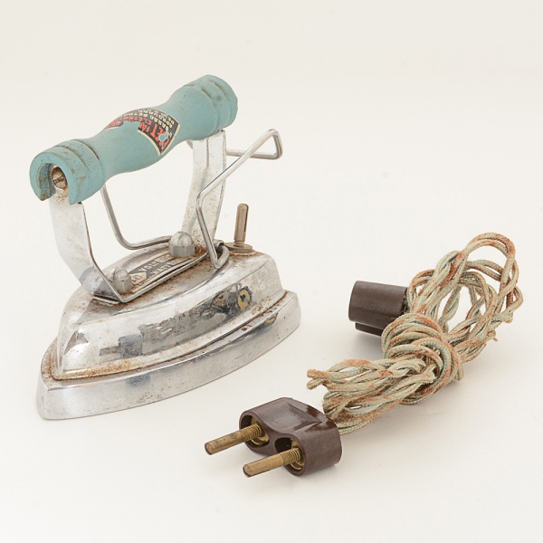 • DIVERSOS, um (1) pequeno ferro de viagem para passar roupa, marca FAET (Fabrica de Aparelhos EletroTérmicos S/A, Rua Barão de Petrópolis 347, Rio de Janeiro), 120 volts, cabo em madeira na tonalidade azul, medindo11 x 6 x 9 cm, usado, não testado e sem garantia, vide foto.