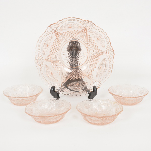 • VIDRO, conjunto com cinco (5) itens: 1 saladeira e 4 taças, tonalidade salmão, translúcidas, modelagem emperolados e geométricos, medindo respectivamente 22,5 cm diâmetro e 11,5 cm diâmetro, sinais de uso, vide foto.