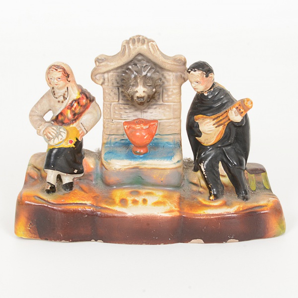 • FAIANÇA PORTUGUESA, uma (1) escultura policromada representando tocador de alaúde e senhora ladeandouma fonte, medindo 12,5 x 4,5 x 9 cm, ideal para coleção de cristaleira, sem marca de manufatura aparente, vide foto.