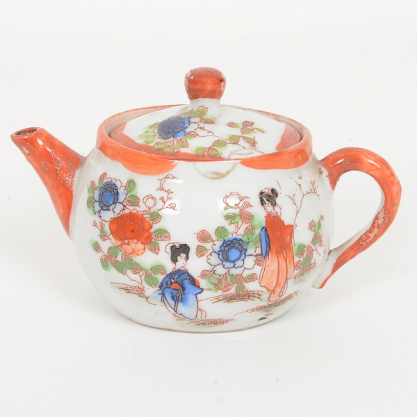 • PORCELANA JAPONESA, um (1) antigo e pequeno bule, ornamentação policromada pintada a mão com cena dogênero, origem KUTANI, marcado em caracteres com exaltação ao Japão DAI NI PON (Grande Japão), além da marcado fabricante, alguns caracteres com falhas, medindo 6,5 cm altura e 7,5 cm diâmetro mais a alça e o bico, sinais de uso,vide foto.