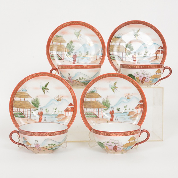 • PORCELANA JAPONESA, quatro (4) xícaras para chá, pintadas a mão em policromia, representando paisagemlacustre com figuras, pagodes, pássaros, montanhas e elementos vegetalistas, padrão IMARI ou KUTANI, marcaOSAKA, ideais para coleção de cristaleira, vide foto.