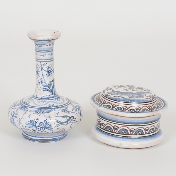 • FAIANÇA PORTUGUESA, dois (2) itens: 1 pequeno vaso com ornamentação pintada a mão na técnica blue andwhite, representando castelo e elementos vegetalistas, baseado em cerâmica de Coimbra do século XVII, medindo 9,5cm altura; 1 pote com tampa na mesma padronização, representando animal e elementos vegetalistas, medindo 7 cmdiâmetro, sinais de uso, vide foto.