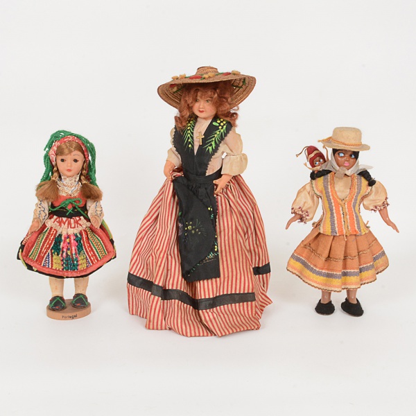 • BRINQUEDOS, três (3) bonecas distintas com cabeças e membros em polímero, vestes em tecido, todas com trajestípicos, uma delas de Portugal, medindo a maior 33 cm, sinais de uso, vide foto.