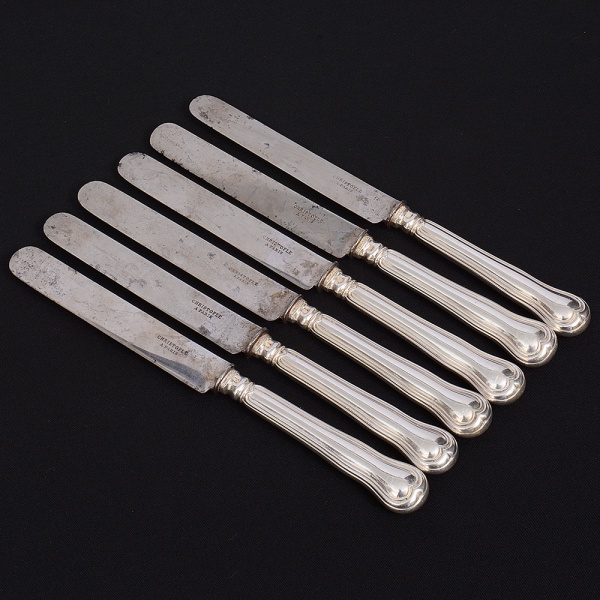 • Christofle, Paris - França(Fundada em 1830 por Charles Christofle). Luxuoso conjunto de facas médias confeccionadas em metal espessurado à prata, fabricação francesa do início do século XX, executado ao estilo do período Louis Philippe. Padrão "Chinon", usado a partir de 1862, conhecido anteriormente como "filet" ou "vieux Paris". Cabo apresenta "ombros" e margem contornada por frisos de terminação cordiforme sobre extremo arredondado. Lâminas em aço marcada CHRISTOFLE A PARIS(apresentam sinais de oxidação). Composto de seis(06) unidades. Marca da manufatura puncionada no verso do cabo. Med.: Comp. 21 cm.