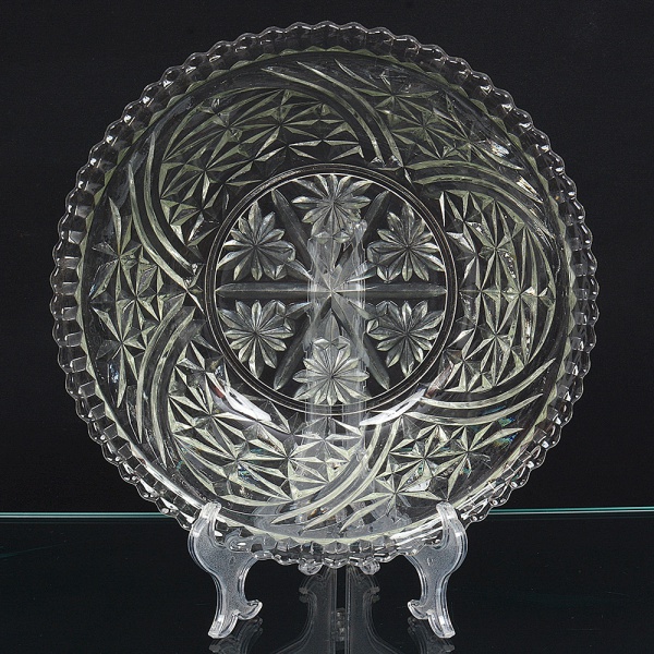 • Bowl executado em meio cristal prensado, formato hemisférico, com borda recortada em gomos regulares, decoração composta por motivos geométricos organizados em campos radiais, fundo com medalhão central circular, decorado por roseta estrelada de múltiplas pontas, subdividida em quatro quadrantes com motivos florais estilizados, área intermediária com faixas curvas entrelaçadas, intercaladas por estrelas facetadas e malha geométrica em losangos, corpo moldado com padrões triangulares e estrelados, formando composição contínua ao redor da peça. Medidas: Alt.: 8 x Diam.: 27 cm.