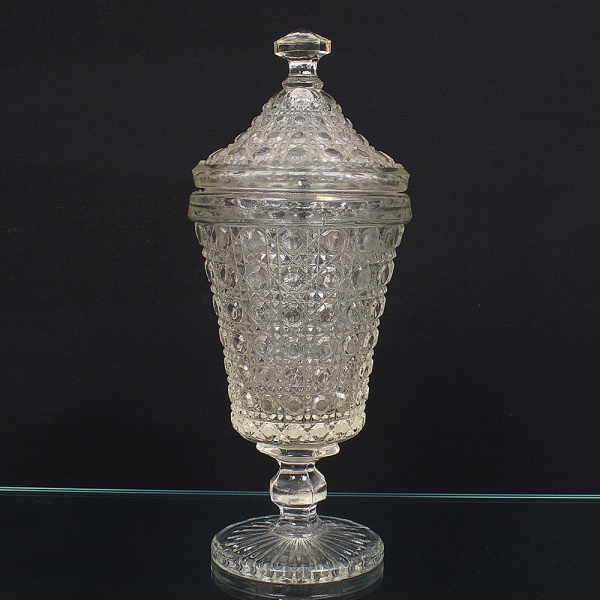 • Grande compoteira executada em vidro prensado, translúcido e incolor, de bojo obcônico ricamente moldado com padrão geométrico, contendo losangos e octogonos relevo, fuste facetado sobre base circular de fundo estrelado, padrão decorativo replicado na tampa. Medidas: Alt.: 31,5 x Diam.: 13,5 cm.
