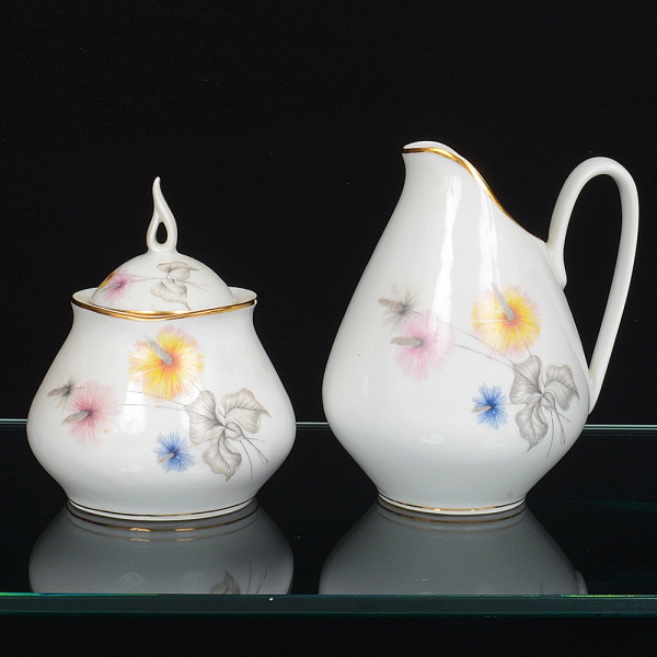 • Porcelana Real, Mauá - SP(Fundada em 1943 por Fritz Erwin Schmidt). Uma(01) leiteira e um(01) açucareiro em porcelana nacional da década de 1960, esmaltagem vítrea na cor branca, decoração aplicada por estampagem policromada, com motivos florais estilizados compostos por flores radiais em tons de rosa e amarelo, acompanhadas por folhas em grisaille, distribuídos no corpo e na tampa, tampa abaulada com pega vazada elevada, moldada na própria porcelana, filetes dourados aplicados na borda superior do corpo e na aba da tampa, alça lateral curvada, bico vertedor ondulado. Marca da manufatura no verso. Medidas: Leiteira: Alt.: x Comp.: x Larg.: ; Açucareiro: Alt.: x Diam.: