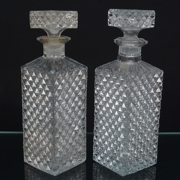 • Duas(02) garrafas para uísque em vidro prensado, translúcido e incolor, corpo quadrangular ricamente moldado com losangos em relevo, tampa achatada, ombro trapezoidal, gargalo circular, borda recortada, fundo estrelado. Med.: Alt. 25 x Comp. 8 x Larg. 8 cm.