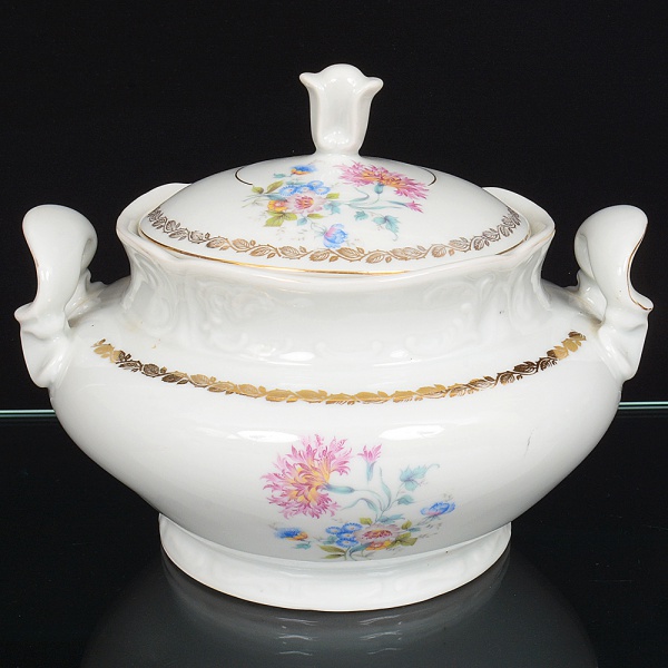 • Porcellana Mauá, Mauá - SP(Fundada em 1937 por Fritz Erwin Schmidt / ativa até 1968). Sopeira em porcelana nacional da década de 1950/60; esmaltagem vítrea na cor branca, decorada com crisântemo e folhagens em estampagem policromada, predominando as tonalidades violeta, rosa, azul e verde; borda recortada em ondualções decorada com aplicações de filete dourado, circundada por volutas relevadas na própria pasta, e faixa contínua de folhagens aplicada em douradura, tampa ligeiramente abaulada encimada por puxador em forma de tulipa, alça laterais reviradas para cima. Marca da manufatura no verso. Medidas: Alt.: 19 x Comp.: 23,5 x Larg.: 22 cm.