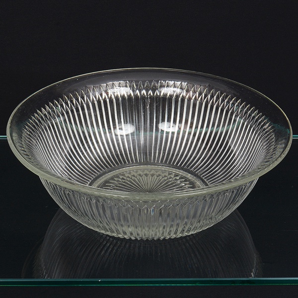 • Bowl em meio cristal prensado, formato hemisférifco, borda ligeiramente revirada para fora, verso decorado  com caneluras verticais contínuas, interrompidas junto à borda por friso geométrico composto por elementos triangulares em relevo regular, com decoração radial em estrela lapidada, delimitada por anel liso, base anelar integrada ao molde. sem marca visível de fabricante. Med.: 8 x Diam.: 24,5 cm.