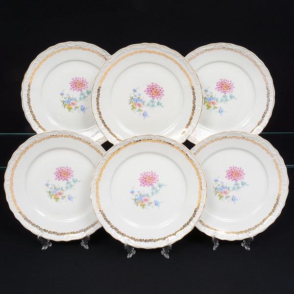 • Porcellana Mauá, Mauá - SP(Fundada em 1937 por Fritz Erwin Schmidt / ativa até 1968). Conjunto de pratos rasos em porcelana nacional da década de 1950/60; esmaltagem vítrea na cor branca, centro decorado com crisântemo e folhagens em estampagem policromada, predominando as tonalidades violeta, rosa, azul e verde; borda recortada em ondualções decorada com aplicações de filete dourado, orla circundada por volutas relevadas na própria pasta, e faixa contínua de folhagens aplicada em douradura. Marca da manufatura no verso. Composto de seis(06) unidades. Medidas: Diam.: 23,5 cm. Um apresenta acentuado bicado na borda.