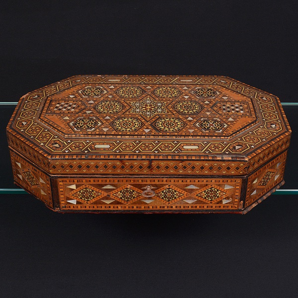 • Caixa octogonal confeccionada em madeira, com tampa articulada por dobradiças metálicas e fecho frontal. Superfície externa integralmente decorada por marchetaria geométrica, composta por padrões simétricos de losangos, estrelas, faixas lineares e painéis poligonais, executados com lâminas de madeiras de diferentes tonalidades e incrustações claras, formando composição radial no tampo e frisos contínuos nas faces laterais, tampo apresenta campo central com motivo estrelado circundado por painéis geométricos repetidos, delimitados por molduras lineares,  laterais exibem painéis losangulares alternados, com incrustações triangulares e retangulares, mantendo coerência formal com o desenho do tampo. Interior em madeira lisa, sem forração, com estrutura montada por encaixes e colagens tradicionais. Necessita reparo na dobradiça, como mostrado nas fotografias. Medidas: Alt.: x Comp.: x Larg.: