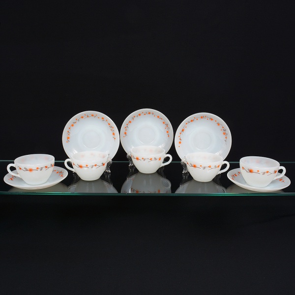 • Conjunto de xícaras para chá em vidro opalinado de tonalidade branco leitoso, dotada de decoração com flores e galhos aplicada por estampagem de tonalidade castanho e laranja, padrão decorativo replicado no pires; bojo hemisférico com alça lateral curvada. Fabricado no Brasil pela empresa Brasividro S.A., sob a marca Termo-Rey, durante a década de 1970. Meds.: Xícara: Alt. 6 x Comp.: 11,5 x Larg.: 10 cm. Pires: Diam.: 15,5 cm.