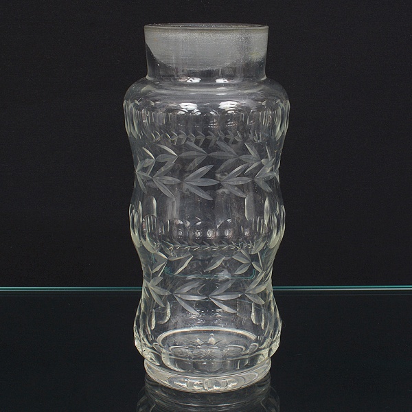 • Garrafa(sem tampa) em cristal lapidado, translúcido e incolor, corpo cilíndrico com perfil levemente ondulado, apresentando boca circular de bordo polido e base circular espessa, decoração lapidada composta por faixas horizontais alternadas, com motivos geométricos e fitomórficos estilizados, incluindo folhas lanceoladas entrecruzadas, ovais facetados e gomos verticais. Parte inferior com estrela lapidada radial no fundo. Lapidação executada em baixo e médio relevo, com cortes regulares e repetitivos. Medidas: Alt.: 19,5 x Diam.: 8,5 cm.