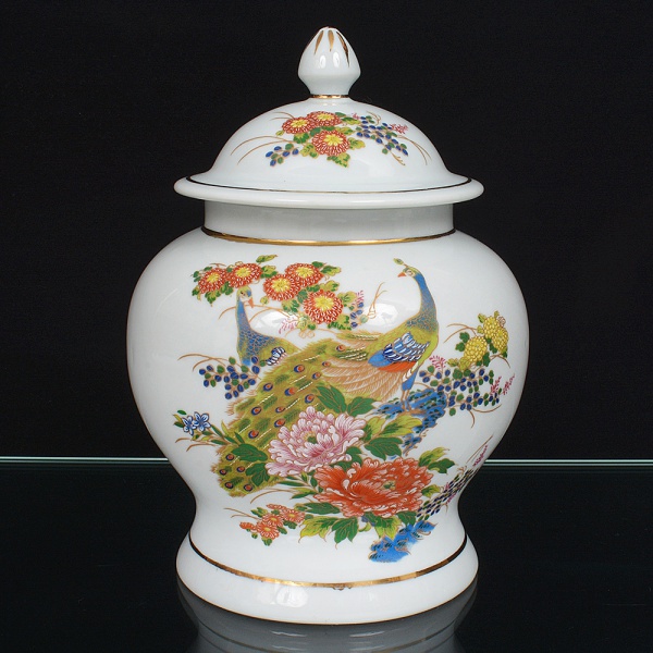 • Pote de porcelana oriental do tipo ginger jar, com corpo bojudo, ombro pronunciado, boca circular e tampa campaniforme em forma de pináculo. Superfície esmaltada em branco, decorada em policromia sob e sobre o vidrado, com representação de aves estilizadas entre ramos florais e peônias, distribuídas no bojo e na tampa. Aplicação de frisos dourados na borda da boca, no ombro, na base e no remate da tampa. Base anelar. Fundo com inscrições em caracteres chineses pintados à mão, em disposição vertical. Técnica de pintura esmaltada (famille rose / famille verte combinadas, policromia oriental). Medidas: Alt.: 22 x Diam.: 16 cm. Apresenta um bicado na borda externa da tampa.