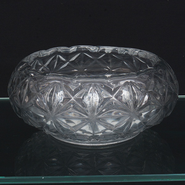 • Centro de mesa em vidro prensado, translúcido e incolor, formato circular, de perfil baixo e abaulado, com borda suavemente recortada e base circular plana, decoração moldada composta por painéis geométricos estrelados em alto-relevo, formando rosetas de múltiplas pontas interligadas por facetas triangulares, distribuídas de maneira contínua ao redor do corpo. Interior decorado por estrela radial moldada no fundo, delimitada por anel circular em relevo. Aba superior com friso interno facetado, acompanhando o contorno da peça. Medida: Alt.: 9 x Diam.: 19 cm.