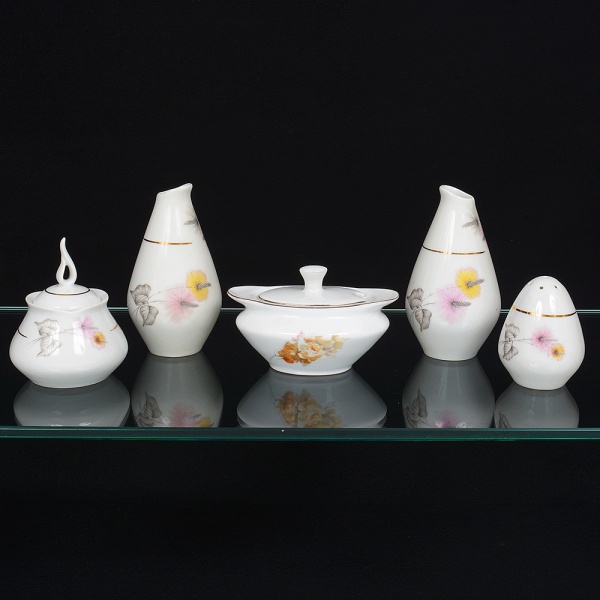 • Cinco(05) itens: a) Porcelana Real, Mauá - SP(Fundada em 1943 por Fritz Erwin Schmidt). Duas galhetas, um saleiro e um pimenteiro em porcelana nacional, esmaltação branca, decoração aplicada por estampagem policromada, com motivos florais estilizados compostos por flores radiais em tons de rosa e amarelo, acompanhadas por folhas em grisaille, distribuídos no corpo, realçado por frisos em douradura. Marca da manufatura ao fundo. Medidas: Galhetas: Alt.: 11,5 x Diam.: 6,5 cm; Saleiro: Alt.: 7 x Diam.: 5 cm; Pimenteiro: Alt.: 9 x Diam.: 7 cm. b) Porcelana Real, Mauá - SP(Fundada em 1943 por Fritz Erwin Schmidt). Mostardeira com tampa em porcelana nacional, esmaltagem vítrea na cor branca, formato oblongo, borda contornada por friso prateado, decoração floral em policromia, tampa reta encimada por puxador obcônico. Marca da manufatura ao fundo. Medidas: Alt.: 6,5 x Comp.: 11 x Larg.: 7,5 cm.