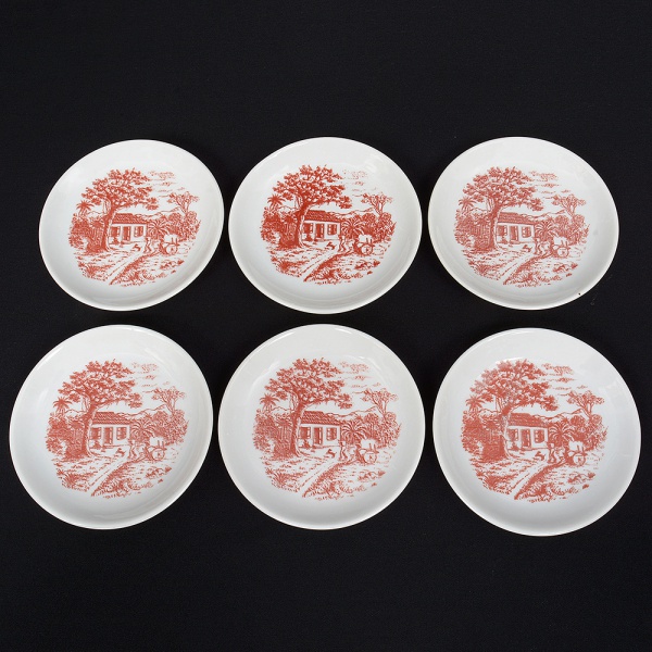 • Conjunto de seis(06) porta-copos em porcelana branca, de aba lisa e cavado central raso, decoração aplicada por transferência monocromática em vermelho, representando cena rural composta por casa, perosonagens em atividade cotidiana, árvore de grande porte em primeiro plano, vegetação tropical e caminho sinuoso. Medida: Diam.: