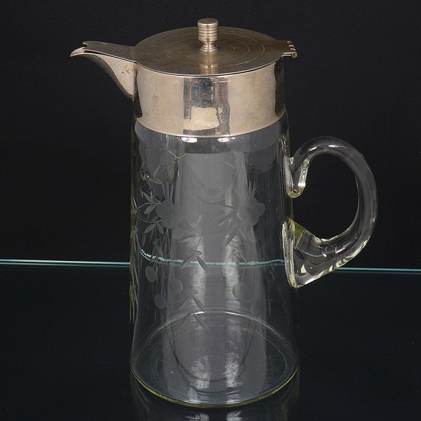 • Jarra executada em cristal europeu, translúcido e incolor, decorada por lapidação manual com motivos fitomórficos distribuídos no bojo; corpo de perfil cilíndrico, alça curvada aplicada sobre a superfície, tampa em metal prateado, com sistema basculante, encimada por puxador central roscado, bico vertedor ondulado. Medidas: Alt.: x Diam.: