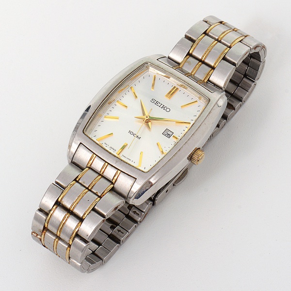 • Relógio de pulso com caixa tonneau em aço inoxidável, vidro plano, coroa lateral para ajuste. Mostrador retangular de coloração clara, com marcadores lineares aplicados, ponteiros centrais para horas, minutos e segundos, e janela de data posicionada às três horas. Inscrições SEIKO, 100M e MOVT JAPAN. Movimento a quartzo calibre 7N82, fabricação japonesa. Resistência à água indicada para 10 bar / 100 metros. Pulseira metálica articulada, em aço inoxidável, com elos centrais em tom dourado, fecho dobrável com trava, assinado SEIKO. Tampa posterior contendo gravações: SEIKO, WATER RESISTANT 10 BAR, STAINLESS STEEL, 7N82-0G00, MOVEMENT JAPAN, numeração de série. Não está funcionando. Medida da caixa: 4 x 3 cm.