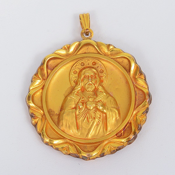 • Medalhão pendente de formato circular, confeccionado em metal espessurado à ouro, com borda recortada em perfil lobado e aro interno circular em relevo. Argola de suspensão articulada, integrada a contrapino tubular estriado. Anverso com representação em baixo-relevo do Sagrado Coração de Jesus, com halo circular, indumentária frontal e emblema do Coração Sagrado, composto por coração anatômico estilizado, coroa de espinhos, chama superior e cruz axial. Reverso com representação em baixo-relevo de Nossa Senhora com o Menino Jesus, ambos coroados, com nimbos radiantes, a figura mariana portando o Menino ao braço esquerdo. Execução por moldagem em matriz, com relevo contínuo em ambas as faces. Peça devocional destinada a corrente ou colar. Medida: Diam.: 4,5 cm.