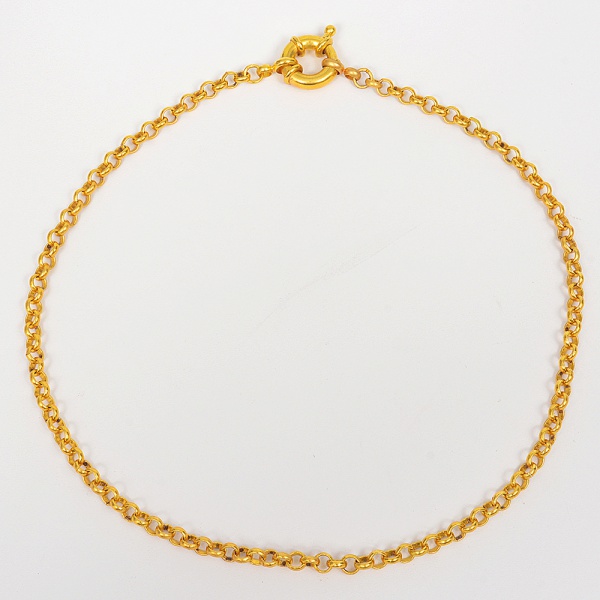 • Corrente confeccionada em metal banhado à ouro, elo de feitio português, articulados de forma contínua, fecho tipo bóia, com mecanismo de mola interna, conectado por argola terminal. Medida fechada: Comp.: 20 cm.