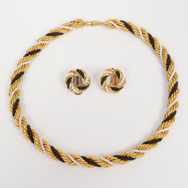 • Colar estruturado em feitio de corda torcida, formada por fios em metla banhado à ouro helicoidais, entrelaçados com contas pretas e brancas, distribuídas de maneira alternada ao longo do comprimento, fecho rosqueável cilíndrico, com encaixe por rosca, integrado às extremidades do colar. Brincos em formato circular com composição correspondente ao colar, fecho tipo presilha. Medidas: Colar: Comp.: 19,5 cm. Brincos: Diam.: 2 cm.