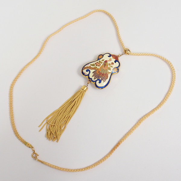 • Colar composto por cordão têxtil trançado, de seção circular, com terminais metálicos e fecho tipo mola. Pingente central de formato recortado, apresentando representação figurativa de pavão em perfil, disposto sobre ramo vegetal, acompanhado por motivos florais. Decoração executada por esmaltação cloisonné, com campos de esmalte policromado separados por filetes metálicos aparentes. Contorno externo delimitado por filetes curvilíneos esmaltados. Parte inferior provida de borla pendente, formada por conjunto de fios metálicos fixados por terminal cilíndrico. Suspensão do pingente realizada por argola metálica articulada conectada ao cordão. Medidas: Comp.: 47 cm. Pingente: Alt.: 5,5 x Comp.: 4 cm.