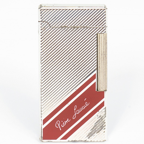 • Isqueiro de coleção Pierre Louvet, de corpo retangular, executado em metal cromado, com acabamento estriado diagonal contínuo nas faces. Face frontal decorada por cartela geométrica diagonal vermelha, aplicada por incrustação, contendo assinatura Pierre Louvet em grafia cursiva. Tampa articulada por eixo lateral, com sistema de abertura basculante. Mecanismo de ignição lateral por roldana serrilhada, com acionamento manual. Base inferior provida de orifício de abastecimento, parafuso regulador e acesso ao compartimento de pedra, dispostos linearmente. Não está funcionando. Apresenta desgastes e marcas de uso, visíveis nas fotos. Medidas: Alt.: 7 x Comp.: 3 cm.