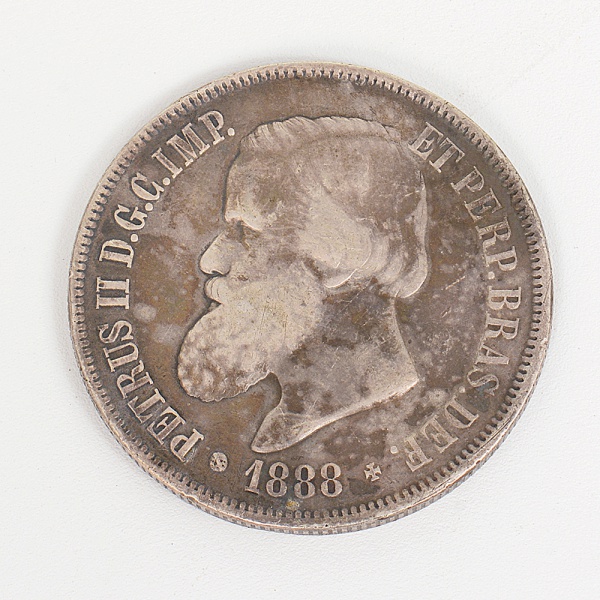 • NUMISMÁTICA. Moeda do Período Imperial Brasileiro, valor de face 2000 Réis, IV FAMÍLIA, 5 TIPO 1886 - 1889, bordo serrilhado, executada em prata 917 milésimos. Anverso (Frente): Busto de D. Pedro II, voltado à esquerda. Inscrição em latim: PETRUS II D. G. C. IMP. ET PERP. BRAS. DEF. (Pedro II, pela Graça de Deus, Imperador e Perpétuo Defensor do Brasil). Ano de cunhagem: 1889, entre uma esfera armilar e uma cruz da Ordem de Cristo. Reverso: As Armas do Império (escudo com a esfera armilar, estrelas e a Cruz da Ordem de Cristo). Inscrição acima: DECRETO DE 1870. Valor facial: 2000 RÉIS. Símbolos: ramos de café e tabaco, unidos por um laço, e uma balança e um caduceu (símbolos do comércio). Medida: Diam.: 37 mm. Peso: 25,3 gramas.